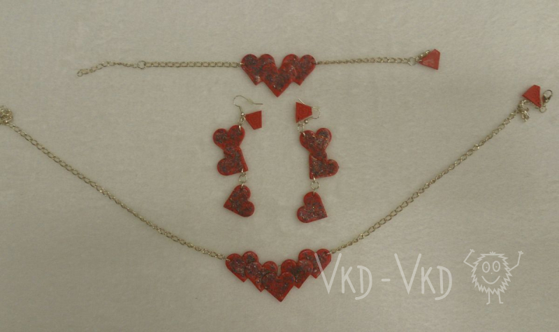 Červená srdíčka, zdobena třpytky, zavěšená jednotlivě v řadě. Perfektní na odpolední procházku. ALL HANDMADE Sada obsahuje - náramek, naušnice, řětízek. …