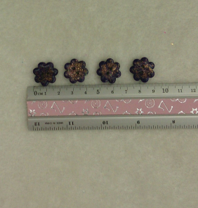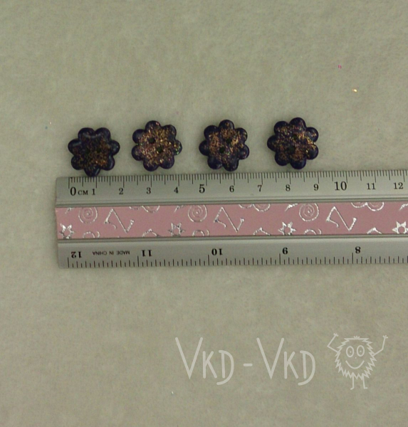 Fialové květinky poseté třpytkami, vhodné jako knoflík nebo jako dekorace.