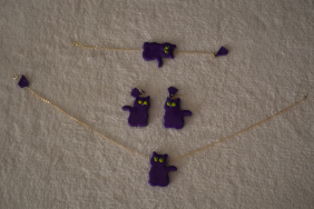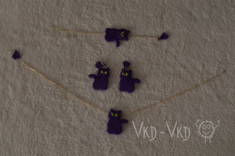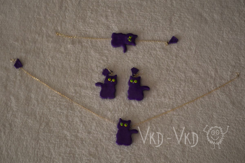 ALL HANDMADE Sada šperků - fialová kočka. Jsi kočka, jsi kočka, jsi kočka...... Jdete na procházku, nebo jen do školy? Sada se skládá z náramku, řetízku a naušnic. Nastavitelná velikost. Přestože se snažíme vyhovět našim zákaznicím co nejdříve, doba dodání může být až 4 týdny. S ohledem na to, že každá sada je vždy vyráběna pro každou jednotlivou objednavatelku a proces výroby zahrnuje několik po sobě následujících dní!!!