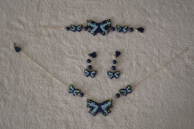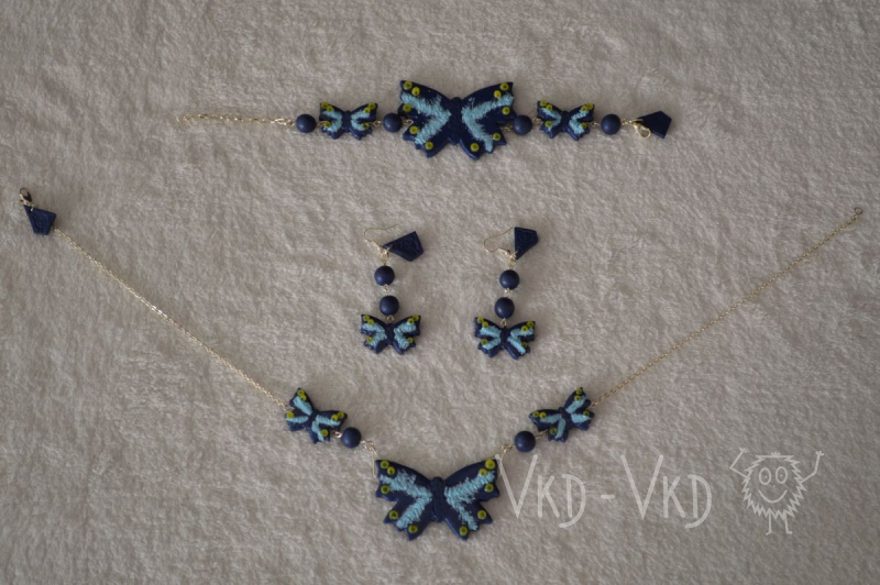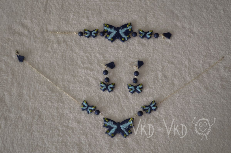 ALL HANDMADE Chcete působit tajemně? Sada šperků - modří motýlci. Tmavomodrý materiál ozdoben jemnými třpytkami. Sada se skládá z náramku, řetízku a naušnic. Nastavitelná velikost. Přestože se snažíme vyhovět našim zákaznicím co nejdříve, doba dodání může být až 4 týdny. S ohledem na to, že každá sada je vždy vyráběna pro každou jednotlivou objednavatelku a proces výroby zahrnuje několik po sobě následujících dní!!!smiley