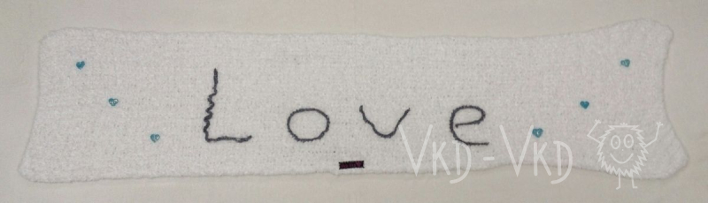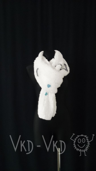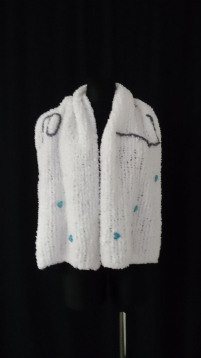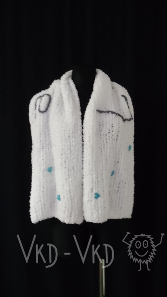 Šála z velmi hebkého a velmi lehkého materiálu, zdobena výšivkou a malými modrými třpytivými srdíčky. Též vhodná jako pléd na přehození přes ramena.