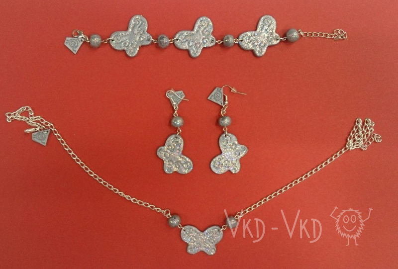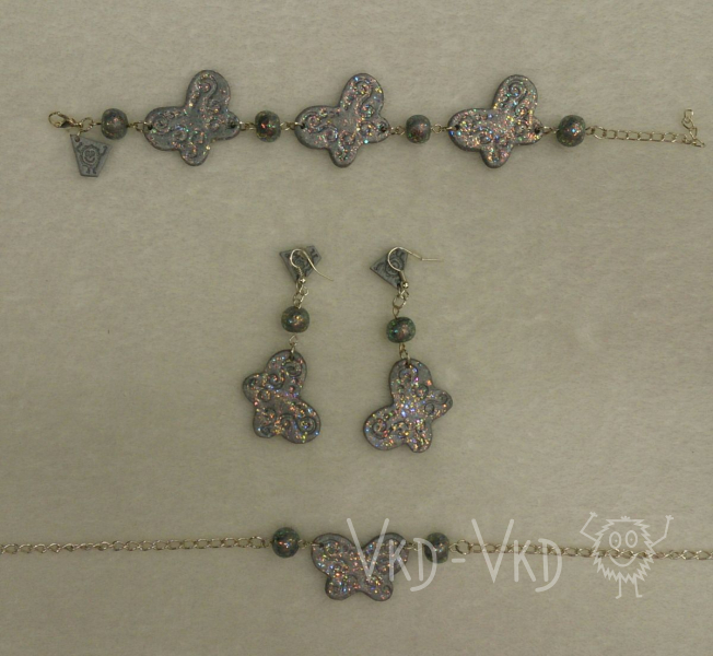 ALL HANDMADE Chcete působit tajemně? Sada šperků - modří motýlci. Tmavomodrý materiál ozdoben jemnými třpytkami. Sada se skládá z náramku, řetízku a…