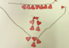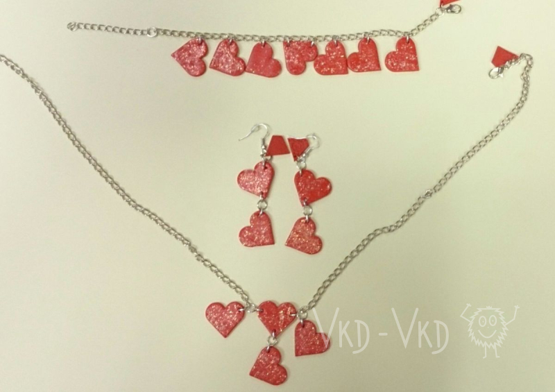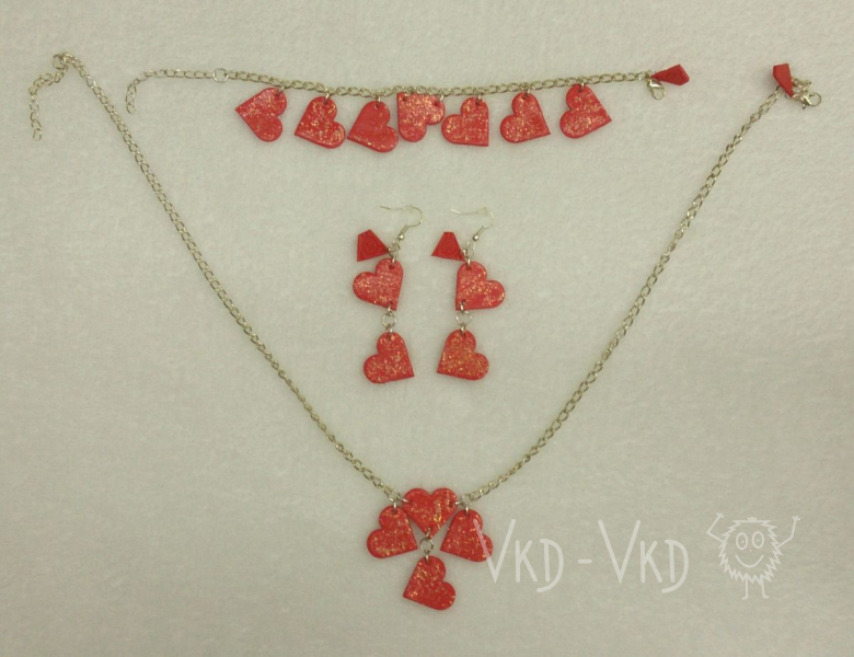 Červená srdíčka zdobená 3D efektem, třpytky, zahřejí na těle i na duši. ALL HANDMADE Sada obsahuje - náramek, naušnice, řětízek. Nastavitelná velikost. …