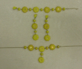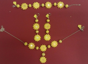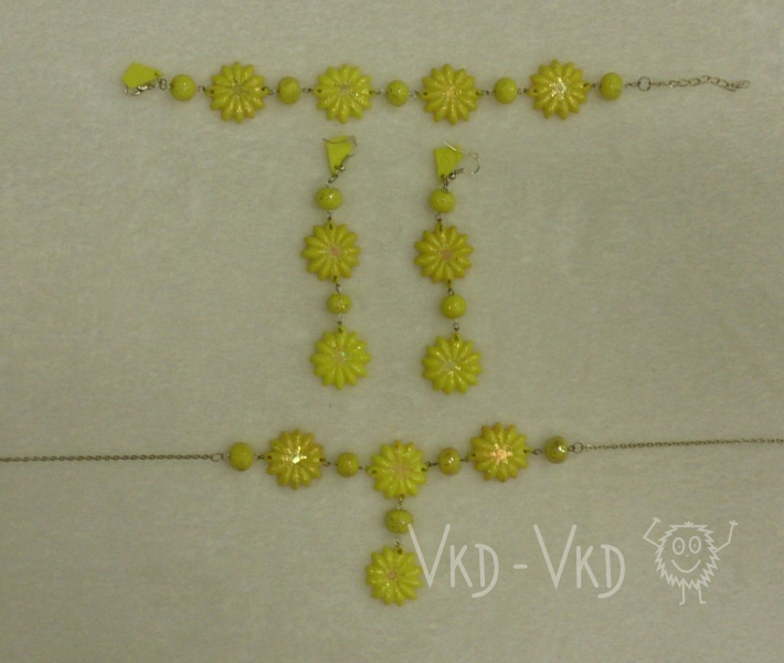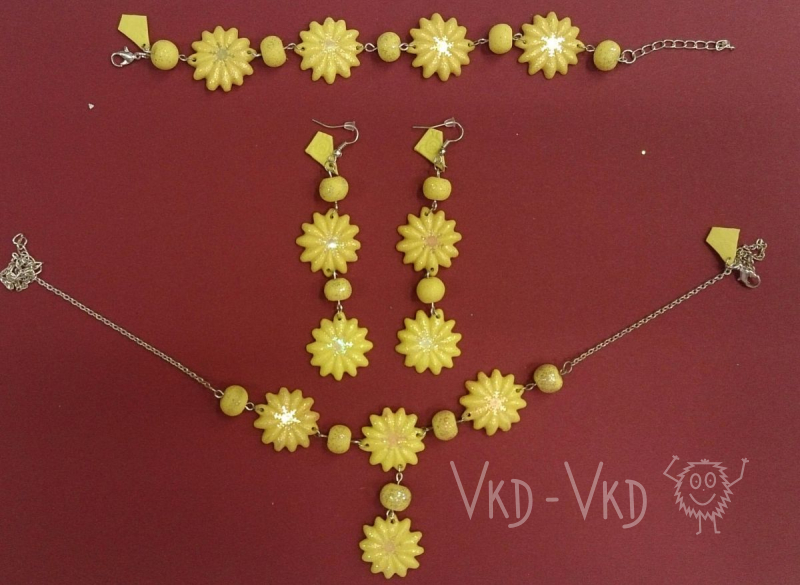 Žluté květinky dekorované sněhovou vločkou a poseté třpytky, jako vánoční nadýchané oblázky. ALL HANDMADE Sada obsahuje - náramek, naušnice, řětízek. Nastavitelná velikost. Doba dodání může být až 4 týdny. Sady jsou vyráběny vždy pro každou jednotlivou objednavatelku.
