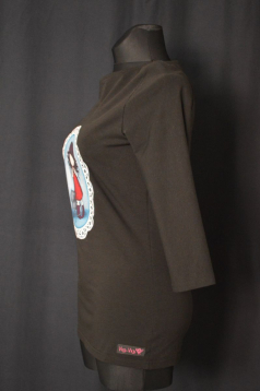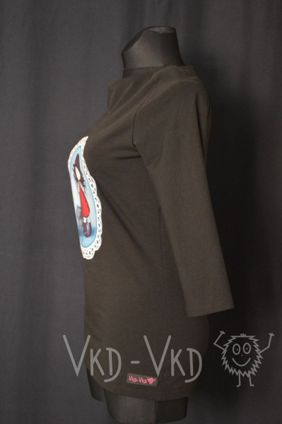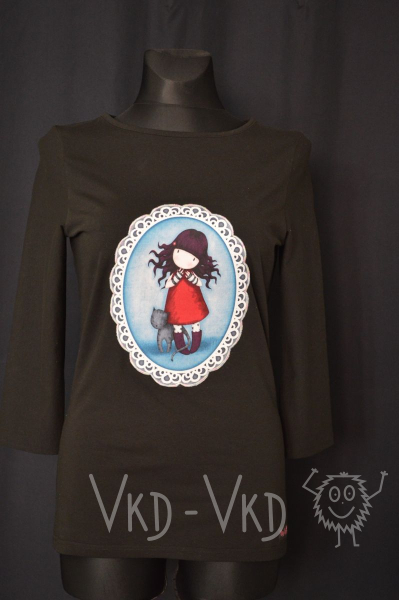 Begrenzte Mengen! Schwarzes T-Shirt mit der Anwendung - ein romantisches Refugium mit einer Puppe. Sehr angenehm tragbar - halblange Ärmel. Nur ein Stück und eine Größe.![]()
